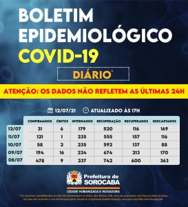 Sorocaba recebeu a notificação de mais 31 casos confirmados da Covid-19, 116 recuperados e seis óbitos, estes ocorridos desde o dia 5 de julho, mas informados pelos hospitais à Vigilância Epidemiológica e computados apenas no dia de hoje (12). Do total de confirmados, 179 estão internados (123 em UTI) e o total de pessoas em recuperação (isolamento domiciliar) é 520.