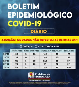 Sorocaba recebeu a notificação de mais 50 casos confirmados da Covid-19, 58 recuperados e dois óbitos, estes ocorridos desde o dia 23 de agosto, mas informados pelos hospitais à Vigilância Epidemiológica e computados apenas no dia de hoje (30 de agosto). Do total de confirmados, 28 estão internados (20 em UTI) e o total de pessoas em recuperação (isolamento domiciliar) é 162.