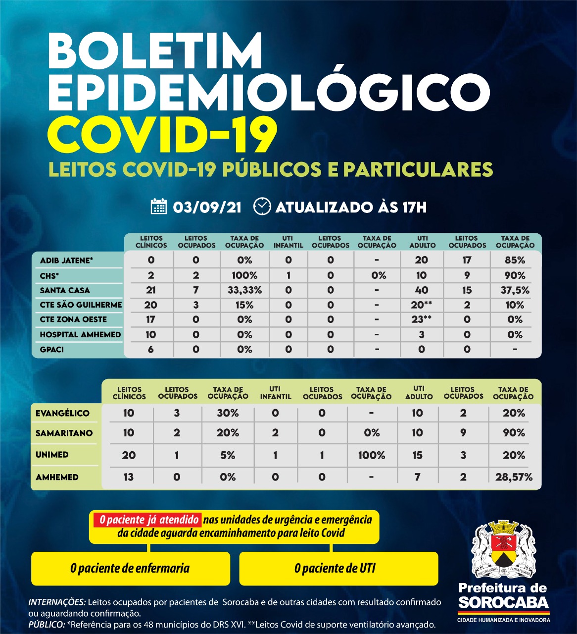 No censo diário de leitos da Covid-19 desta sexta-feira (3), no Hospital Estadual Adib Jatene, os 20 leitos de UTI Covid (Unidade de Terapia Intensiva) encontram-se 85% ocupados. Outro hospital de esfera estadual, o Conjunto Hospitalar de Sorocaba (CHS), possui dois leitos clínicos Covid e dois estão ocupados. O único leito de UTI infantil Covid encontra-se sem paciente. Dos 10 leitos de UTI Covid disponibilizados neste hospital, nove estão ocupados.