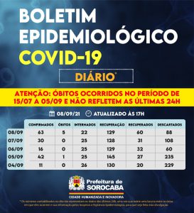 Sorocaba recebeu a notificação de mais 63 casos confirmados da Covid-19, 60 recuperados e cinco óbitos, estes ocorridos desde o dia 15 de julho, mas informados pelos hospitais à Vigilância Epidemiológica e computados no dia de hoje (8 de setembro). Do total de confirmados, 22 estão internados (19 em UTI) e o total de pessoas em recuperação (isolamento domiciliar) é 129.