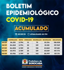 A Prefeitura de Sorocaba, por meio da Secretaria da Saúde (SES), registrou aumento do número de recuperados da Covid-19 nesta quinta-feira (9), chegando ao total de 81.334. Já, os casos confirmados com a doença passaram de 84.065 para 84.215 na cidade. Os óbitos confirmados se mantiveram em 2.794. A taxa de letalidade no município é de 3,3%, abaixo da taxa estadual, que é de 3,4%, e acima da taxa nacional, que se encontra em 2,8%.