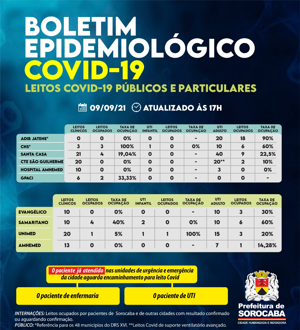 No censo diário de leitos da Covid-19 desta quinta-feira (9), no Hospital Estadual Adib Jatene, os 20 leitos de UTI Covid (Unidade de Terapia Intensiva) encontram-se 90% ocupados. Outro hospital de esfera estadual, o Conjunto Hospitalar de Sorocaba (CHS), possui três leitos clínicos Covid e três estão ocupados. O único leito de UTI infantil Covid encontra-se sem paciente. Dos 10 leitos de UTI Covid disponibilizados neste hospital, seis estão ocupados.
