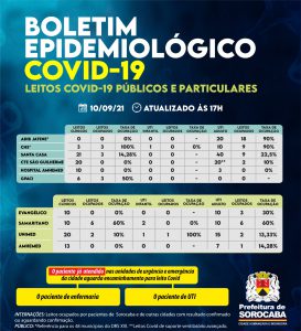 No censo diário de leitos da Covid-19 desta sexta-feira (10), no Hospital Estadual Adib Jatene, os 20 leitos de UTI Covid (Unidade de Terapia Intensiva) encontram-se 90% ocupados. Outro hospital de esfera estadual, o Conjunto Hospitalar de Sorocaba (CHS), possui três leitos clínicos Covid e três estão ocupados. O único leito de UTI infantil Covid encontra-se sem paciente. Dos 10 leitos de UTI Covid disponibilizados neste hospital, nove estão ocupados.