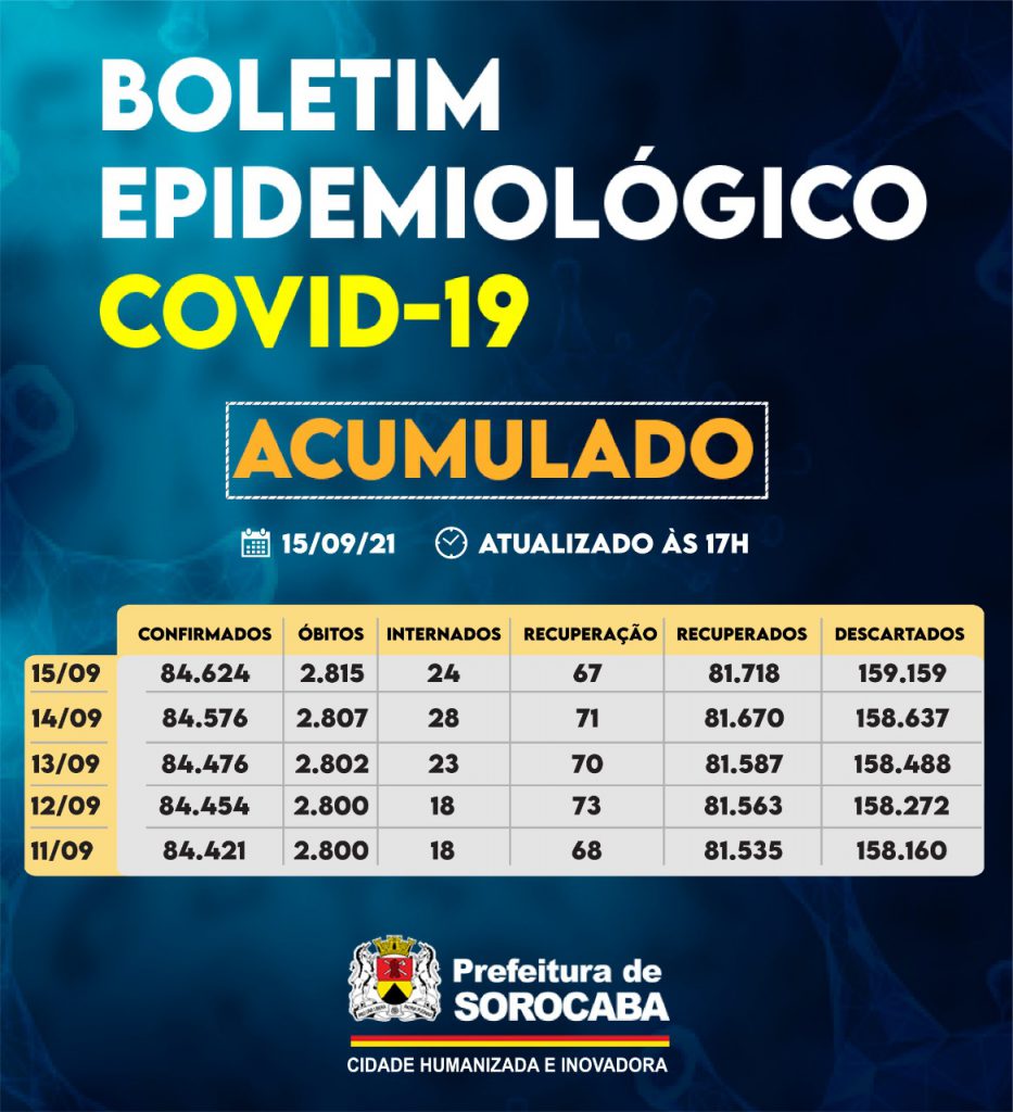 A Prefeitura de Sorocaba, por meio da Secretaria da Saúde (SES), registrou aumento do número de recuperados da Covid-19 nesta quarta-feira (15), chegando ao total de 81.718. Já, os casos confirmados com a doença passaram de 84.576 para 84.624 na cidade. Os óbitos confirmados aumentaram para 2.815. A taxa de letalidade no município é de 3,3%, abaixo da taxa estadual, que é de 3,4%, e acima da taxa nacional, que se encontra em 2,8%.