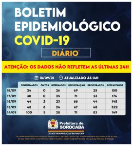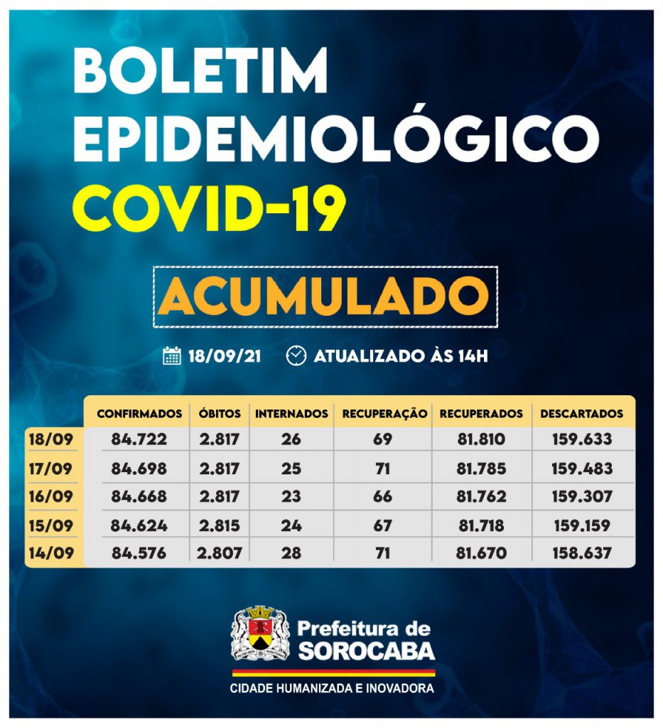 A Prefeitura de Sorocaba, por meio da Secretaria da Saúde (SES), registrou aumento do número de recuperados da Covid-19 neste sábado (18), chegando ao total de 81.810. Já, os casos confirmados com a doença passaram de 84.698 para 84.722 na cidade. Os óbitos confirmados se mantiveram em 2.817. A taxa de letalidade no município é de 3,3%, abaixo da taxa estadual, que é de 3,4%, e acima da taxa nacional, que se encontra em 2,8%.