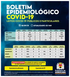 No censo diário de leitos da Covid-19 deste sábado (18), no Hospital Estadual Adib Jatene, os 20 leitos de UTI Covid (Unidade de Terapia Intensiva) encontram-se 65% ocupados. Outro hospital de esfera estadual, o Conjunto Hospitalar de Sorocaba (CHS), possui dois leitos clínicos Covid e dois estão ocupados. O único leito de UTI infantil Covid encontra-se sem paciente. Dos 10 leitos de UTI Covid disponibilizados neste hospital, sete estão ocupados.