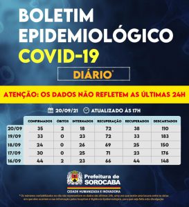 Sorocaba recebeu a notificação de mais 35 casos confirmados da Covid-19, 38 recuperados e dois óbitos, estes ocorridos desde o dia 17 de setembro, mas informados pelos hospitais à Vigilância Epidemiológica e computados no dia de hoje (20 de setembro). Do total de confirmados, 18 estão internados (11 em UTI) e o total de pessoas em recuperação (isolamento domiciliar) é 72.