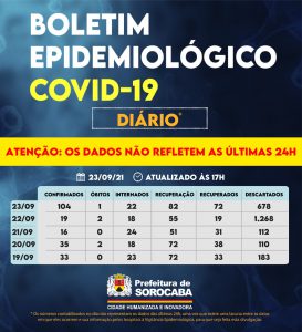 Sorocaba recebeu a notificação de mais 104 casos confirmados da Covid-19, 72 recuperados e um óbito, este ocorrido no dia 22 de setembro, mas informado pelo hospital à Vigilância Epidemiológica e computado no dia de hoje (23 de setembro). Do total de confirmados, 22 estão internados (16 em UTI) e o total de pessoas em recuperação (isolamento domiciliar) é 82.