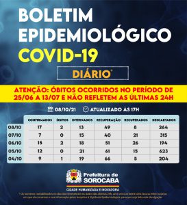 Sorocaba recebeu a notificação de mais 17 casos confirmados da Covid-19, oito recuperados e dois óbitos, estes ocorridos desde o dia 25 de junho, mas informados pelo hospitais à Vigilância Epidemiológica e computados apenas no dia de hoje (8 de outubro). Do total de confirmados, 13 estão internados (10 em UTI) e o total de pessoas em recuperação (isolamento domiciliar) é 49.