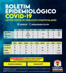 No censo diário de leitos da Covid-19 desta sexta-feira (22), no Hospital Estadual Adib Jatene, os 20 leitos de UTI Covid (Unidade de Terapia Intensiva) encontram-se 30% ocupados. Outro hospital de esfera estadual, o Conjunto Hospitalar de Sorocaba (CHS), possui dois leitos clínicos Covid e dois estão ocupados. O único leito de UTI infantil Covid encontra-se sem paciente. Dos 10 leitos de UTI Covid disponibilizados neste hospital, seis estão ocupados.