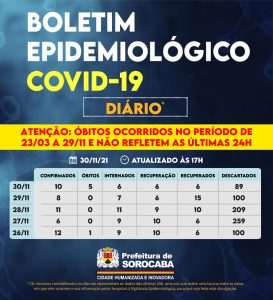 Sorocaba recebeu a notificação de mais 10 casos confirmados da Covid-19, seis recuperados e cinco óbitos, estes ocorridos desde o dia 23 de março, mas informados pelos hospitais à Vigilância Epidemiológica e computados apenas no dia de hoje (30 de novembro). Do total de confirmados, seis estão internados ( cinco em UTI) e o total de pessoas em recuperação (isolamento domiciliar) é seis.