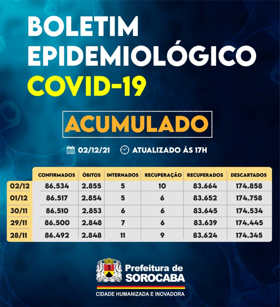 A Prefeitura de Sorocaba, por meio da Secretaria da Saúde (SES), registrou aumento do número de recuperados da Covid-19 nesta quinta-feira (2), chegando ao total de 83.664. Já, os casos confirmados com a doença passaram de 86.517 para 86.534 na cidade. Os óbitos confirmados aumentaram para 2.855. A taxa de letalidade no município é de 3,2%, abaixo da taxa estadual, que é de 3,5%, e acima da taxa nacional, que se encontra em 2,8%.