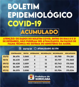 Sorocaba recebeu a notificação de mais 41 casos confirmados da Covid-19, 23 recuperados e três óbitos, estes ocorridos desde o dia 20 de dezembro, mas informados pelo hospitais à Vigilância Epidemiológica e computados no dia de hoje (22 de dezembro). Do total de confirmados, sete estão internados (três em UTI) e o total de pessoas em recuperação (isolamento domiciliar) é seis.