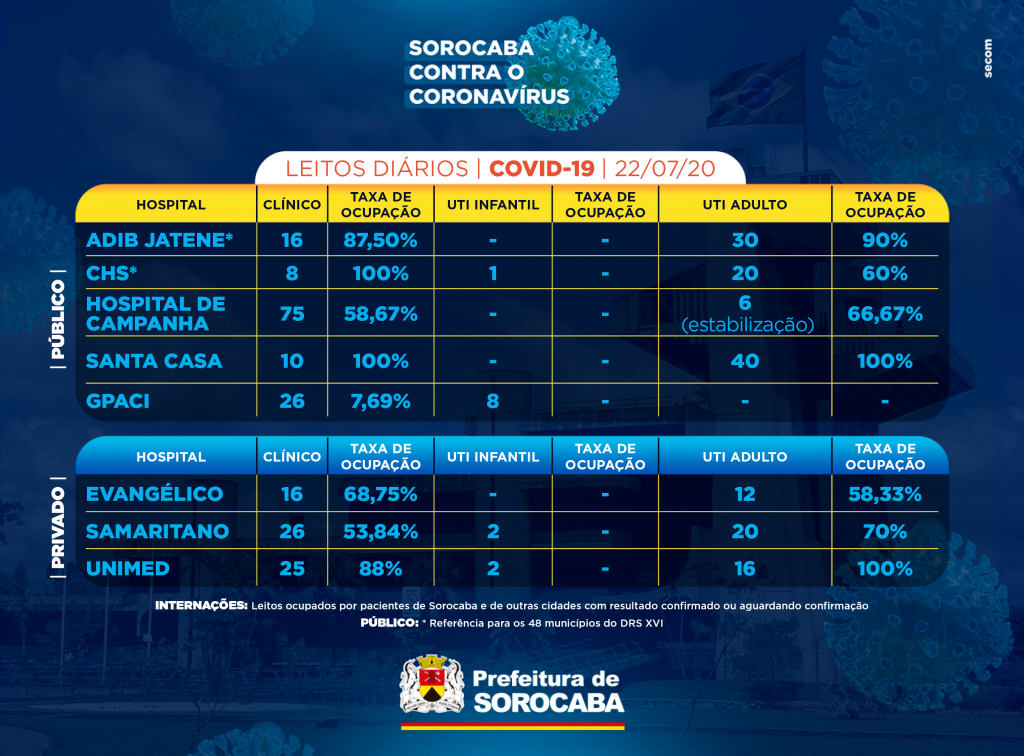 A Prefeitura de Sorocaba, por meio da Secretaria da Saúde (SES), registrou mais 12 novas mortes confirmadas com a Covid-19, nesta quarta-feira (22). Apenas três mortes ocorreram neste dia, as outras nove foram entre os dias 15 e 21 de julho. Ou seja, são dados resultantes de retroalimentação. Já os casos confirmados com a doença passaram de 9.625 para 9.720 na cidade. Os óbitos com a confirmação da doença aumentaram para 208.