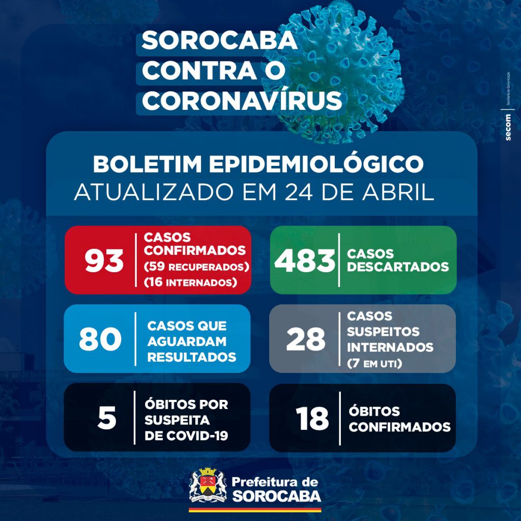 Além dos óbitos, a Prefeitura de Sorocaba, por meio da Secretaria da Saúde (SES), registrou mais 14 novos casos confirmados com a COVID-19 nesta sexta-feira. Com isso, já são 93 casos confirmados na cidade. Deste total, 16 estão internados (sete em UTI) e 59 já se encontram recuperados.
