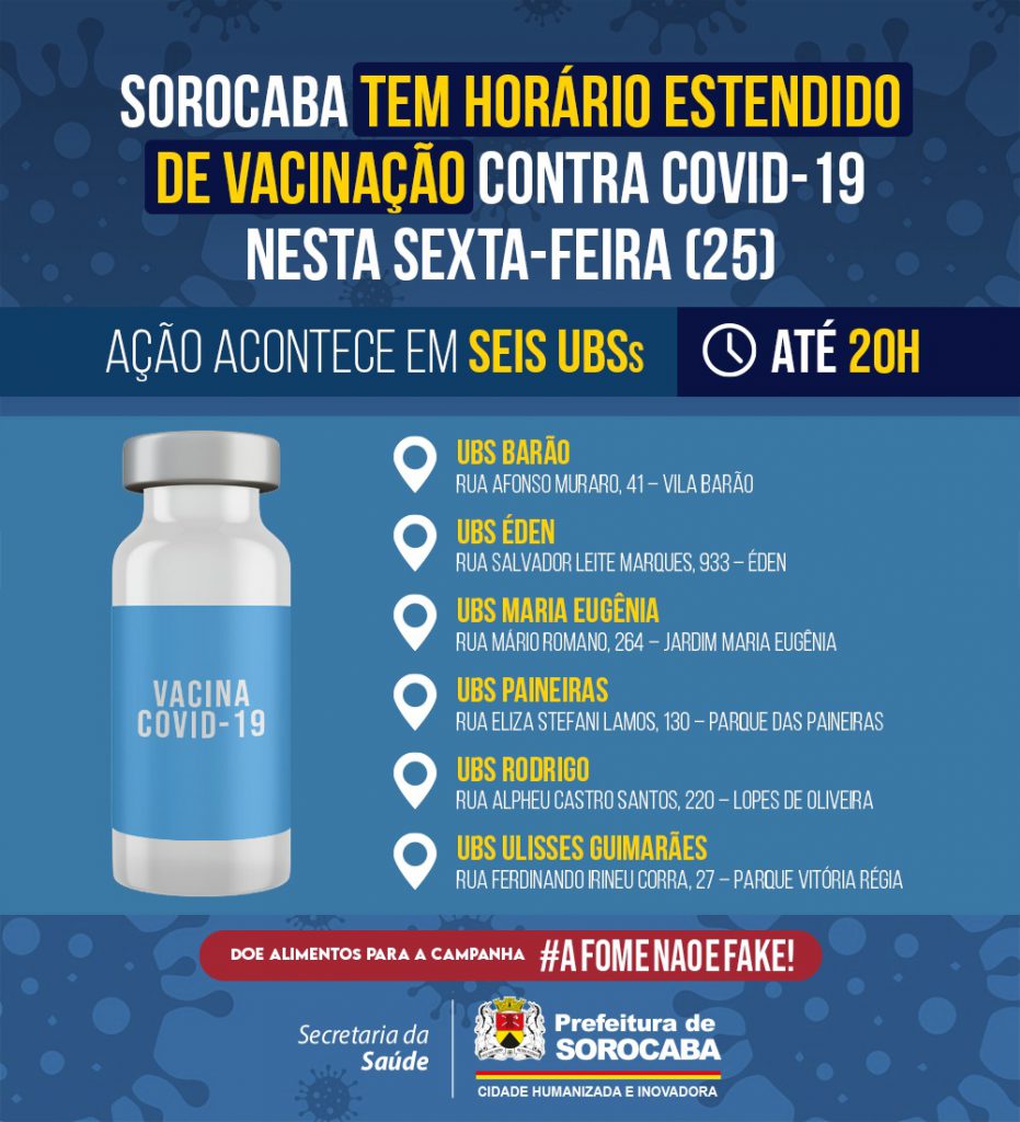 Com o intuito de sempre ampliar a oferta de vacinação aos munícipes, principalmente àqueles que não conseguem se imunizar durante a semana, no período das 8h às 16h, o Município ofertará a aplicação da vacina contra a Covid-19 nesta sexta-feira (25), em horário estendido, das 8h até as 20h. A imunização, que atenderá todos os públicos já informados, acontecerá em seis UBSs: Barão, Éden, Maria Eugênia, Paineiras, Rodrigo e Ulisses Guimarães.
