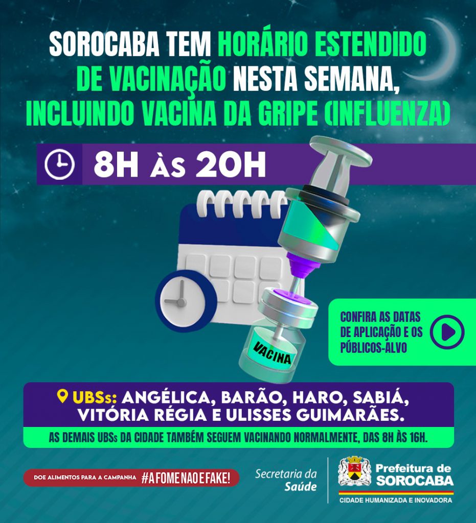 Com o intuito de sempre ampliar a oferta de vacinação aos munícipes, principalmente àqueles que não conseguem se imunizar durante a semana, no horário habitual, o Município ofertará a aplicação de todas as vacinas disponíveis nesta semana (até 14/4) em horário estendido, das 8h até as 20h, em seis Unidades Básicas de Saúde: Angélica, Barão, Haro, Sabiá, Vitória Régia e Ulisses Guimarães. As demais UBSs da cidade seguem vacinando normalmente, das 8h às 16h.