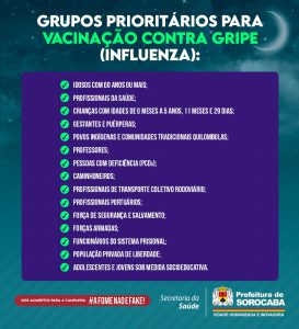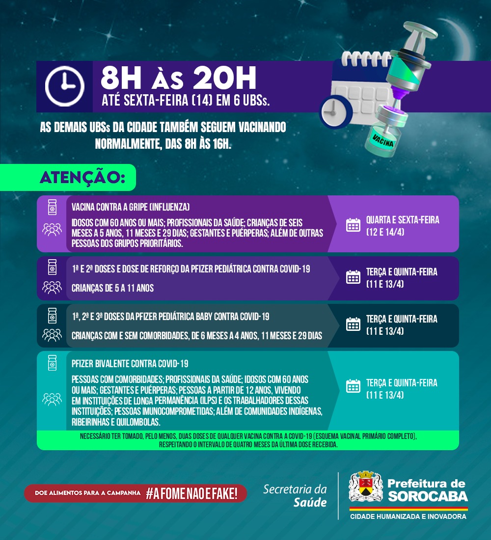 As vacinas contra a gripe (Influenza), para idosos com 60 anos ou mais; profissionais da Saúde; crianças de seis meses a 5 anos, 11 meses e 29 dias; gestantes e puérperas; além de outras pessoas dos grupos prioritários serão aplicadas na quarta-feira (12/4) e na sexta-feira (14/4), já tendo sido oferecidas nesta segunda-feira (10/4), enquanto que as vacinas contra Covid-19 serão disponibilizadas na terça-feira (11/4) e na quinta-feira (13/4). As vacinas Pfizer Baby, Pfizer Pediátrica e Pfizer Adulto, assim como todas as outras do Calendário Municipal, igualmente serão fornecidas aos respectivos públicos-alvo.