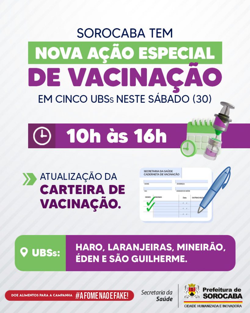 Com o intuito de sempre ampliar a oferta de vacinação aos munícipes, principalmente àqueles que não conseguem se imunizar durante a semana, o Município de Sorocaba ofertará mais uma possibilidade de atualização da Carteira de Vacinação, neste sábado (30), das 10h às 16h, em cinco Unidades Básicas de Saúde (UBSs): Haro, Laranjeiras, Mineirão, Éden e São Guilherme.