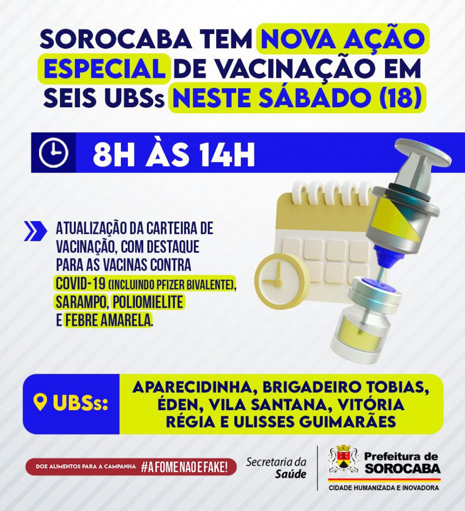Com o intuito de sempre ampliar a oferta de vacinação aos munícipes, principalmente àqueles que não conseguem se imunizar durante a semana, o Município de Sorocaba ofertará mais uma possibilidade de atualização da Carteira de Vacinação, com destaque para as vacinas contra Covid-19 (incluindo a Pfizer Bivalente), Sarampo, Poliomielite e Febre Amarela, neste sábado (18), das 8h às 14h, em seis Unidades Básicas de Saúde (UBSs): Aparecidinha, Brigadeiro Tobias, Éden, Vila Santana, Vitória Régia e Ulisses Guimarães