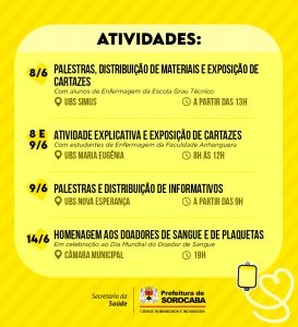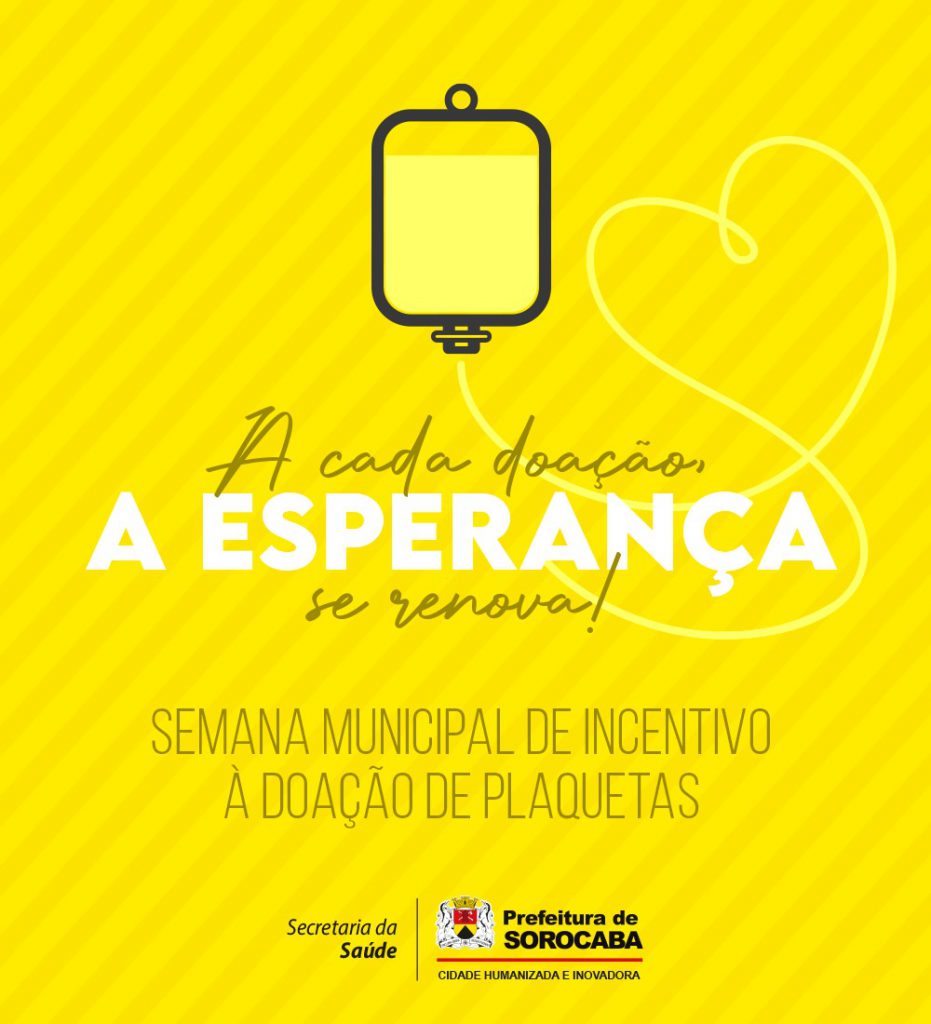 A Prefeitura de Sorocaba, por meio da Secretária da Saúde (SES), realizará, ao longo desta semana, ações voltadas para a divulgação da Semana Municipal de Incentivo à Doação de Plaqueta.