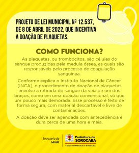 As atividades endossam o Projeto de Lei Municipal Nº 12.537, de 8 de abril de 2022, que incentiva a doação. De autoria do presidente da Comissão de Saúde da Câmara Municipal e doador de plaquetas há alguns anos, vereador Fábio Simoa, a iniciativa conta com apoio do Poder Executivo sorocabano na difusão das informações sobre o tema.