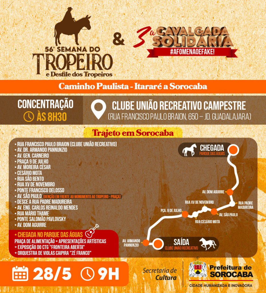 Com o intuito de celebrar a 56ª Semana do Tropeiro, a Prefeitura de Sorocaba realiza, no próximo dia 28 de maio, a partir das 9h, o tradicional Desfile dos Tropeiros na cidade, que, neste ano, une-se à 3ª Cavalgada Solidária #AFOMENAOEFAKE!. A concentração acontece a partir das 8h30, no Clube União Recreativo Campestre, no Jardim Guadalajara, com destino ao Parque das Águas, no Jardim Abaeté, onde o evento será concluído com uma grande festa aberta a todos. No trajeto, os cavaleiros passam em frente ao Monumento ao Tropeiro, próximo à Santa Casa de Misericórdia, na Avenida São Paulo, local onde o grupo receberá a costumeira benção da tropa.