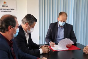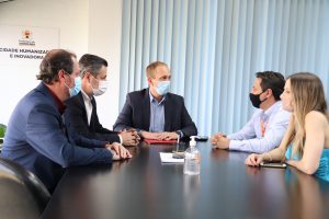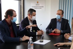 O prefeito Rodrigo Manga, ao lado dos secretários de Desenvolvimento Econômico, Trabalho e Turismo (Sedettur), Robson Coivo, e de Planejamento (Seplan), Paulo Henrique Marcelo, recebeu, na tarde desta quinta-feira (26), em seu gabinete, no Paço Municipal, a visita de executivos do supermercado Atacadão, que fizeram o anúncio da construção da segunda loja da rede em Sorocaba, com um investimento de R$ 80 milhões e a geração de 600 novas vagas de emprego, entre diretas e indiretas.