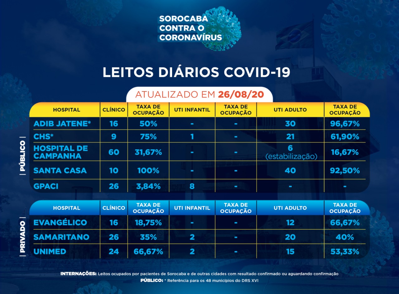Sorocaba recebeu a notificação de mais 147 novos casos confirmados da Covid-19 nesta quarta-feira (26). Do total de confirmados, 61 estão internados (30 em UTI) e o total de pessoas em recuperação (isolamento domiciliar) é 403.