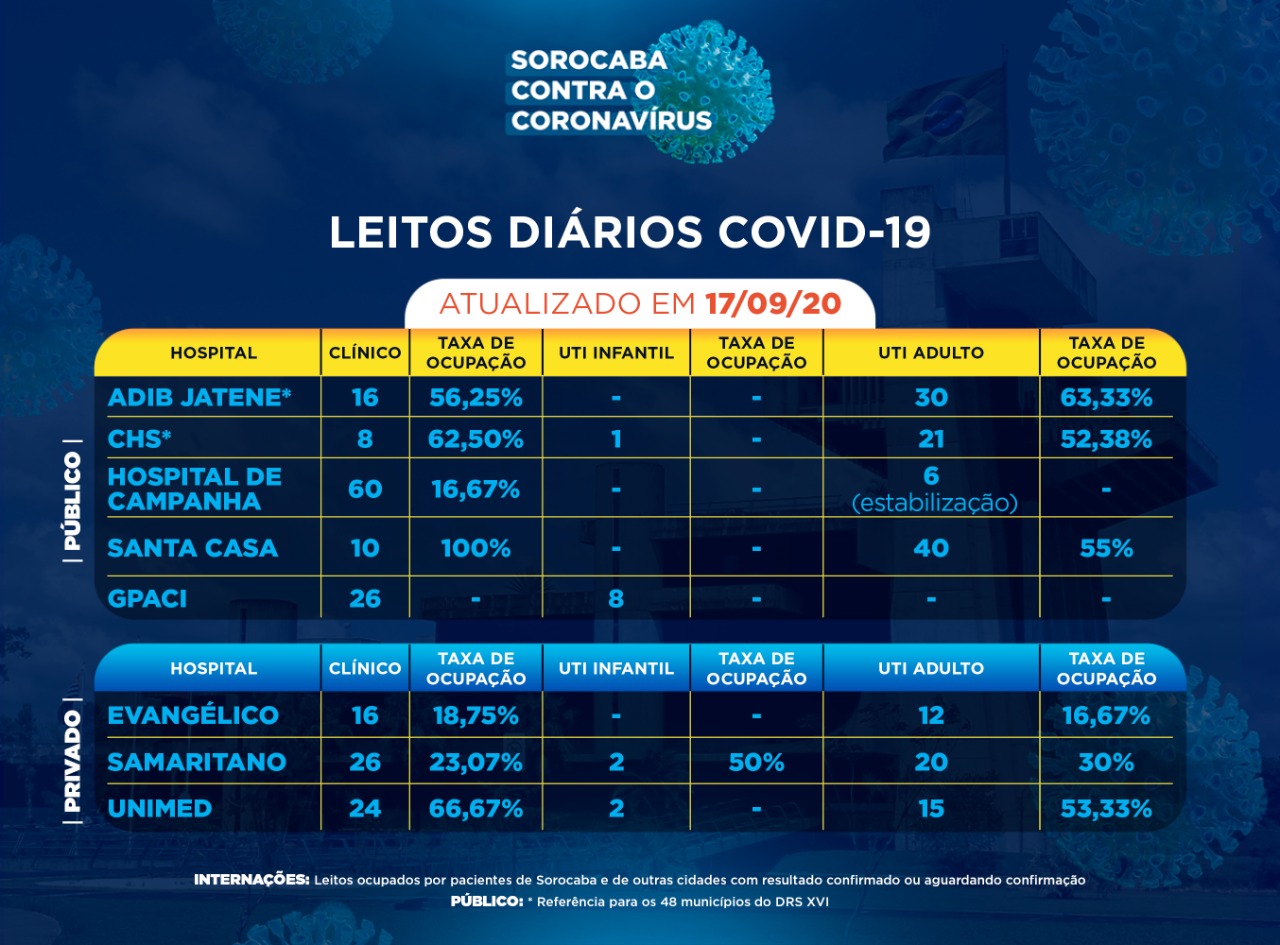 Sorocaba recebeu a notificação de mais 100 novos casos confirmados da Covid-19 nesta quinta-feira (17). Do total de confirmados, 49 estão internados (27 em UTI) e o total de pessoas em recuperação (isolamento domiciliar) é 290.
