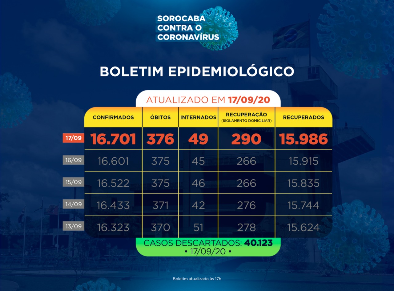 A Prefeitura de Sorocaba, por meio da Secretaria da Saúde (SES), registrou 15.986 recuperados da Covid-19, nesta quinta-feira (17). Já os casos confirmados com a doença passaram de 16.601 para 16.701 na cidade. Os óbitos com a confirmação da doença aumentaram para 376.
