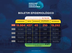 A Prefeitura de Sorocaba, por meio da Secretaria da Saúde (SES), registrou 19.292 recuperados da Covid-19, neste sábado (31). Já os casos confirmados com a doença passaram de 19.961 para 19.984 na cidade. Os óbitos com a confirmação da doença aumentaram para 437.