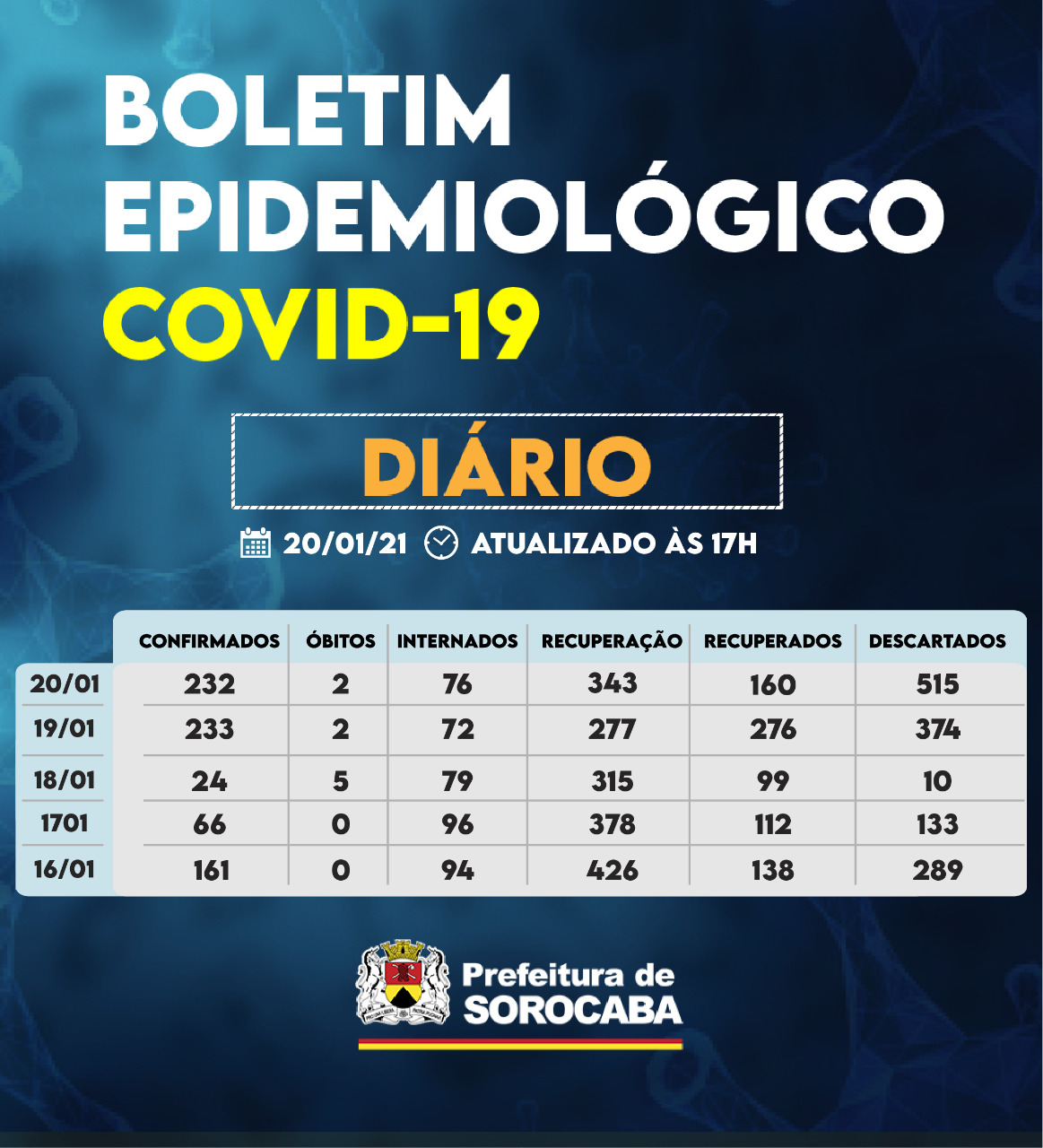 Sorocaba recebeu a notificação de mais 232 casos confirmados da Covid-19, 160 recuperados e dois óbitos nesta quarta-feira (20). Do total de confirmados, 76 estão internados (36 em UTI) e o total de pessoas em recuperação (isolamento domiciliar) é 343.