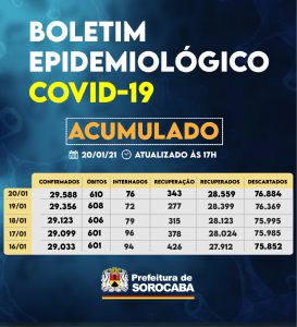 A Prefeitura de Sorocaba, por meio da Secretaria da Saúde (SES), registrou aumento nos recuperados da Covid-19 nesta quarta-feira (20), chegando ao total de 28.559. Já, os casos confirmados com a doença passaram de 29.356 para 29.588 na cidade. Os óbitos com a confirmação da doença aumentaram para 610 e a taxa de letalidade no município é de 2,06%, abaixo da taxa estadual, que é de 3,1% e da nacional, que se encontra em 2,5%.