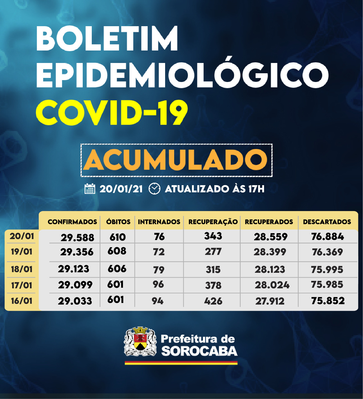 Sorocaba totaliza 29.588 casos da Covid-19, 28.559 recuperados e 610 óbitos