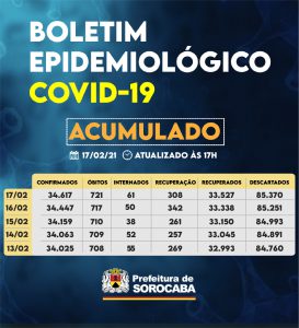Sorocaba recebeu a notificação de mais 170 casos confirmados da Covid-19, 189 recuperados e quatro óbitos, esses ocorridos desde o dia 12 de fevereiro, mas informados pelo hospitais à Vigilância Epidemiológica e computados apenas no dia de hoje (17). Do total de confirmados, 61 estão internados (42 em UTI) e o total de pessoas em recuperação (isolamento domiciliar) é 308.