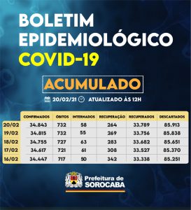 A Prefeitura de Sorocaba, por meio da Secretaria da Saúde (SES), registrou aumento nos recuperados da Covid-19 neste sábado (20), chegando ao total de 33.789. Já, os casos confirmados com a doença passaram de 34.815 para 34.843 na cidade. Os óbitos com a confirmação da doença se mantiveram em 732 e a taxa de letalidade no município é de 2,1%, abaixo da taxa estadual, que é de 2,9% e da nacional, que se encontra em 2,4%.