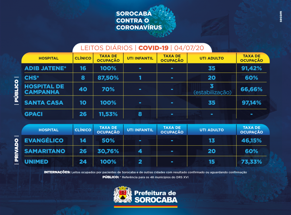 A Prefeitura de Sorocaba, por meio da Secretaria da Saúde (SES), registrou mais duas novas mortes confirmadas com o novo coronavírus, neste sábado (04). Já os casos confirmados com a doença passaram de 6.110 para 6.402 na cidade. Os óbitos com a confirmação da doença aumentaram para 139.