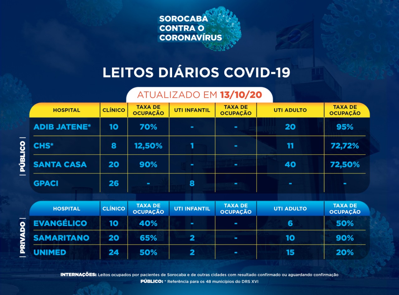 Sorocaba recebeu a notificação de mais 85 novos casos confirmados da Covid-19 nesta terça-feira (13). Do total de confirmados, 31 estão internados (20 em UTI) e o total de pessoas em recuperação (isolamento domiciliar) é 289.