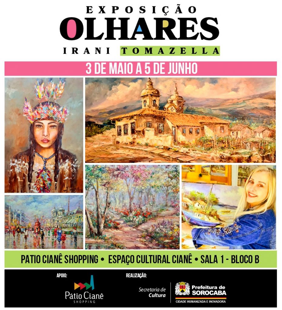 A exposição “Olhares” será atração gratuita, a partir desta terça-feira (3), no Pátio Cianê Shopping, com 16 obras da artista plástica Irani Tomazella, todas produzidas na técnica espatulada. Promovida pela Prefeitura de Sorocaba, por meio da Secretaria de Cultura (Secult), a mostra gratuita poderá ser visitada no Espaço Cultural Cianê, Sala 1, do Bloco B do empreendimento.