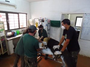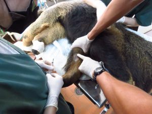 Para que os exames fossem feitos com toda a segurança para a equipe e para o animal, o tamanduá-bandeira foi anestesiado e levado ao Setor Veterinário do Zoológico. Lá, foi realizada a pesagem, conferência de microchip, avaliação clínica geral e coleta de sangue para exames laboratoriais.