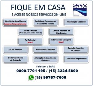 O Saae, além dos serviços on-line oferecidos pela sua agência virtual, disponibiliza ainda canais de comunicação diretos de atendimento ao munícipe, pelos WhatsApps: (15) 98158-0442 (pedidos de religação de água) e (15) 99850-3936 (para informar sobre falta de água, vazamentos de água e esgoto, limpeza de bocas de lobo e troca de registro), bem como os telefones 0800-7701195 (ligação gratuita) e (15) 3224-5800. Por fim, o e-mail: fale@saaesorocaba.sp.gov.br e o WhatsApp: (15) 99767-7606, para informações durante a pandemia da Covid-19.