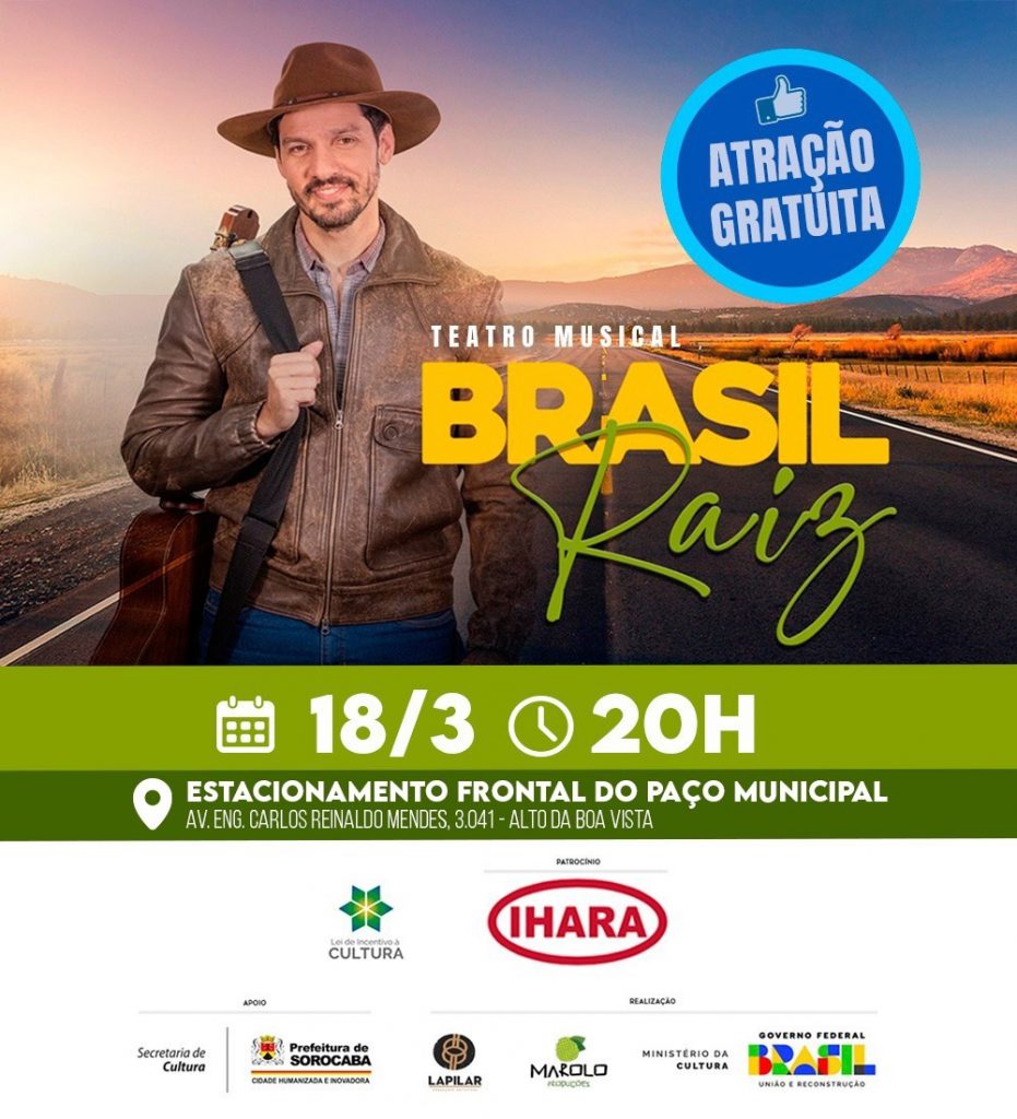 A população sorocabana poderá prestigiar o teatro musical “Brasil Raiz – Missão de Filho”, no dia 18 de março, às 20h, com entrada gratuita. A atração, que seria realizada no Parque das Águas, em razão das fortes chuvas que atingiram a cidade e todo o estado de São Paulo, agora, possui um novo local para a sua realização, o estacionamento frontal do Paço Municipal, no Alto da Boa Vista. A apresentação é uma iniciativa da IHARA, empresa especializada em tecnologia para proteção de cultivos, e conta com o apoio da Prefeitura de Sorocaba, por meio da Secretaria de Cultura (Secult).