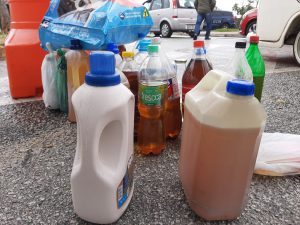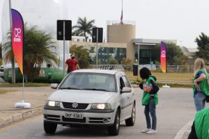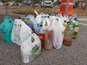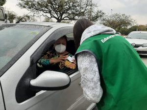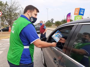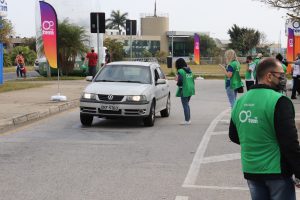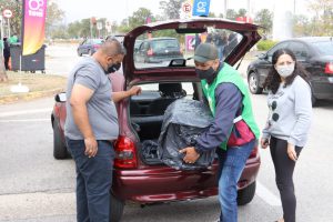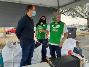 Em uma das primeiras estações do drive-thru sustentável, o cidadão, sem sair do carro, pôde entregar resíduos eletrônicos, pilhas, baterias e óleo de cozinha usado, evitando que esses itens sejam descartados de forma inadequada na natureza, impactando a saúde pública e gerando danos ao meio ambiente.