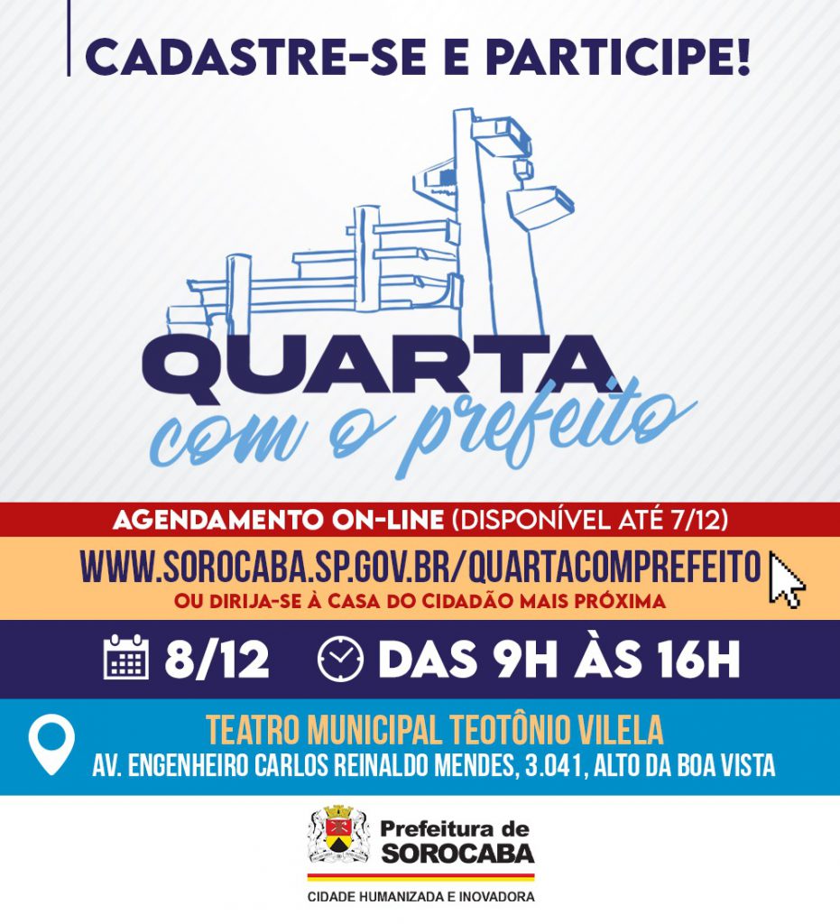 O agendamento on-line para a próxima edição do “Quarta com o Prefeito” está disponível e seguirá até as 14h do dia 7 de dezembro, no site da Prefeitura de Sorocaba (www.sorocaba.sp.gov.br). Serão disponibilizadas 500 vagas, sendo 250 para o período da manhã, das 9h às 12h, e 250 para o período da tarde, das 13h às 16h, no Teatro Municipal “Teotônio Vilela”.