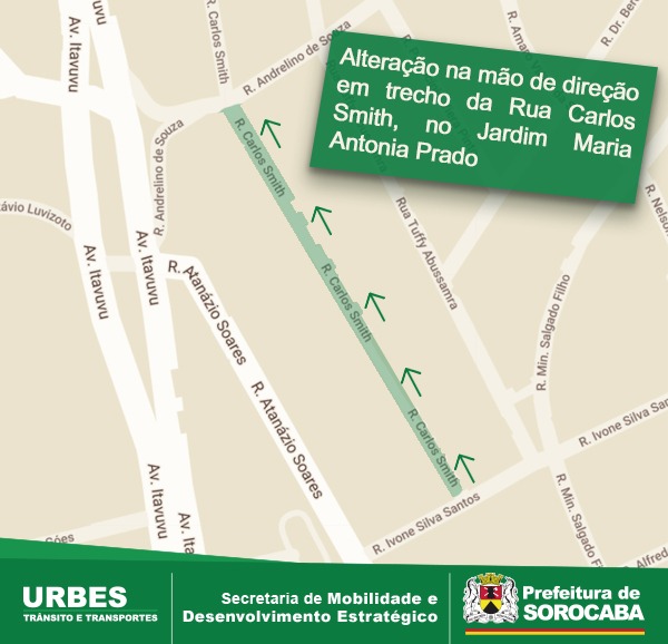A Secretaria de Mobilidade e Desenvolvimento Estratégico (Semob) alterou, nesta sexta-feira (4/6), o sentido de direção em trecho da Rua Carlos Smith, no Jardim Maria Antônia Prado, Zona Norte da cidade. A via passa a ter sentido único de direção, desde a Rua Ivone da Silva Santos até a Rua Andrelino de Souza.