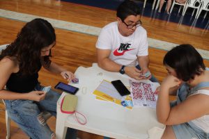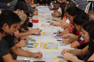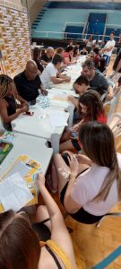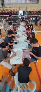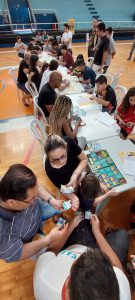 Mesas e cadeiras foram montadas para acomodar os participantes, mas teve quem preferiu sentar no chão da quadra mesmo ou ficar junto à arquibancada.