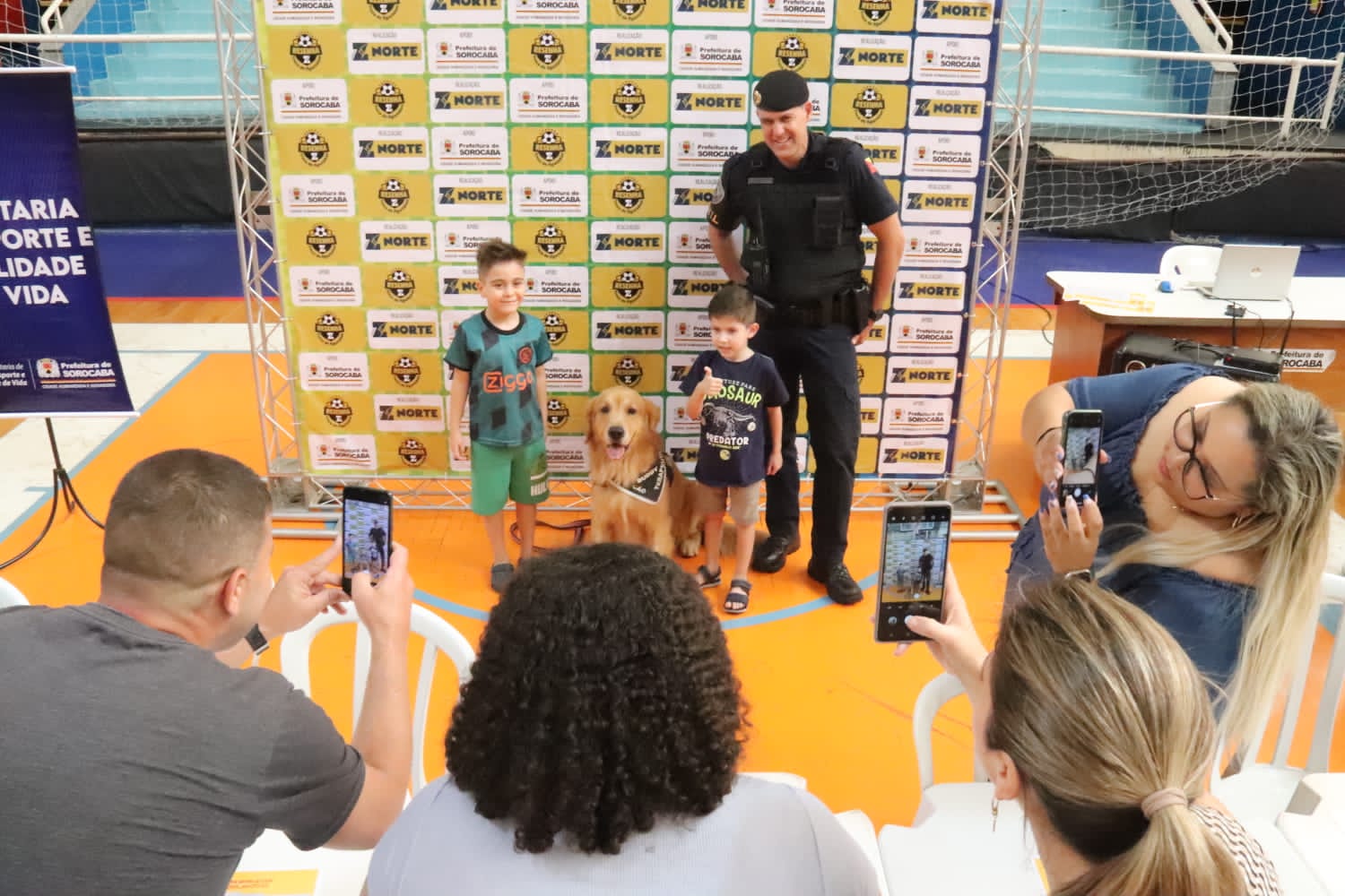 Entre uma troca e outra de figurinhas, uma pausa para as famílias e crianças tirarem fotos com o cão terapeuta Buddy, do Canil da Guarda Municipal (GCM) de Sorocaba, que marcou presença no evento.