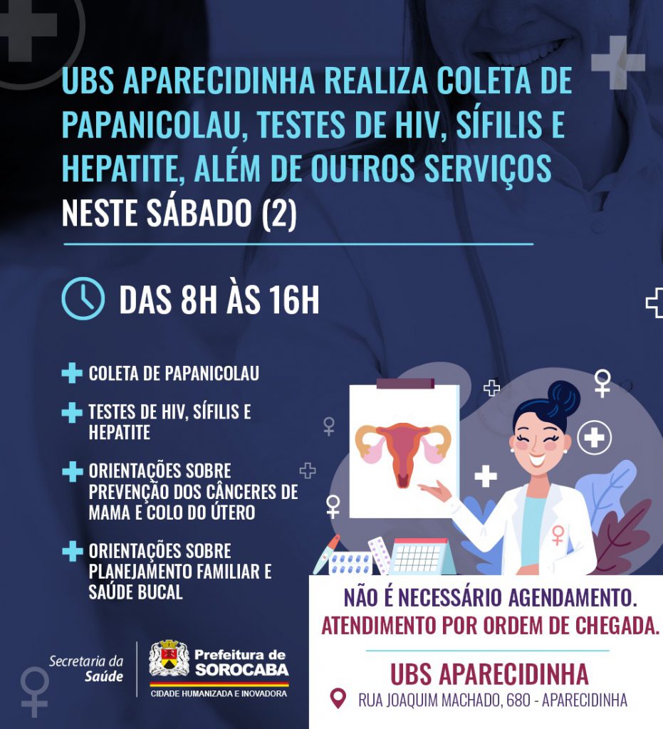 A Unidade Básica de Saúde (UBS) Aparecidinha realiza, neste sábado (2), das 8h às 16h, a ação “Saúde da Mulher” para a coleta do exame Papanicolau, além de testes rápidos para identificar possíveis casos de HIV, sífilis e hepatite. A ação tem como objetivo atender moradores da região que não conseguem realizar seus exames preventivos durante a semana.