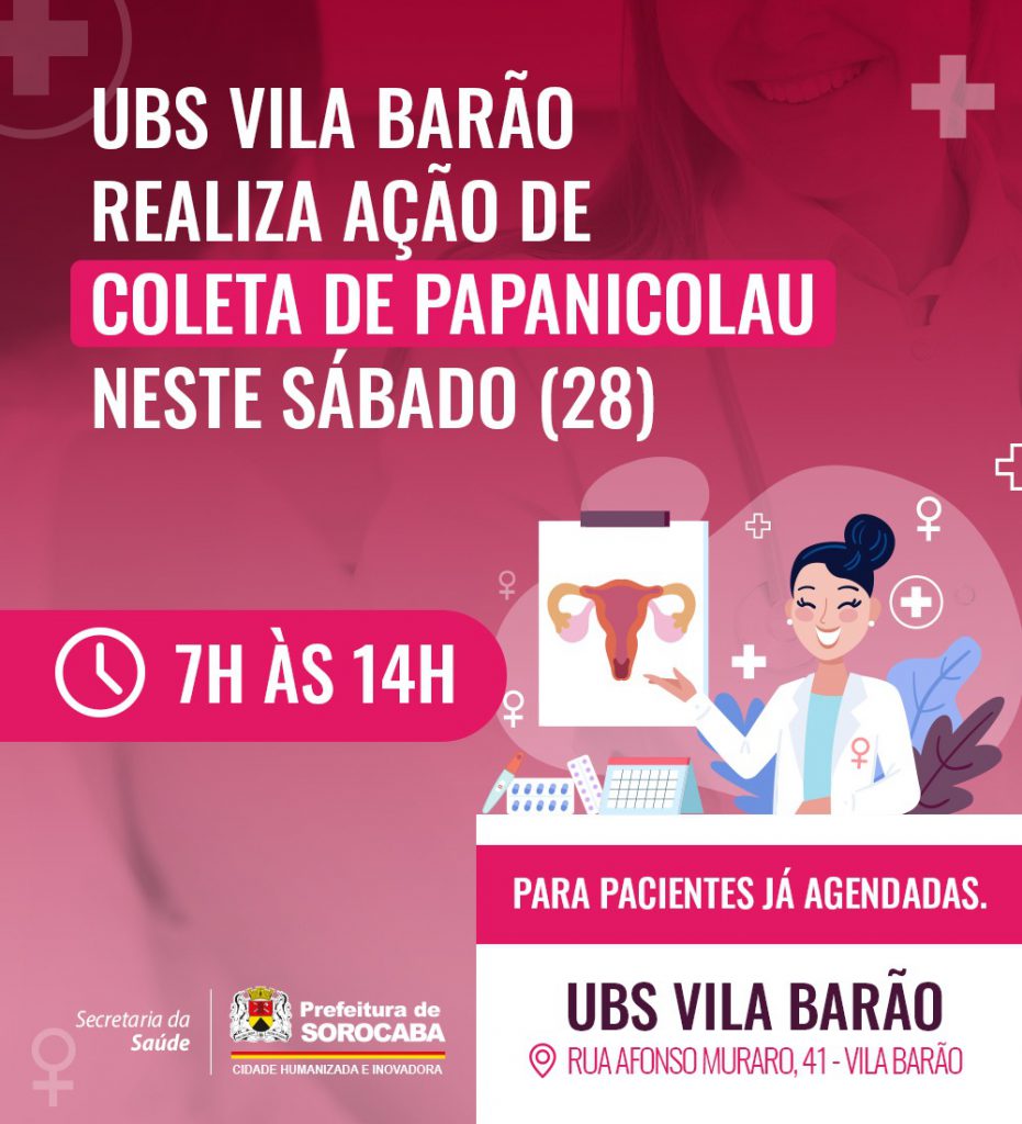 A Unidade Básica de Saúde (UBS) Barão realiza, neste sábado (28), das 7h às 14h, ação de coleta do exame Papanicolau para pacientes pré-agendadas. A iniciativa tem como objetivo atender moradores da região que não conseguem realizar seus exames preventivos durante a semana.